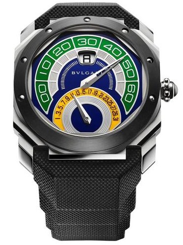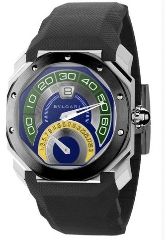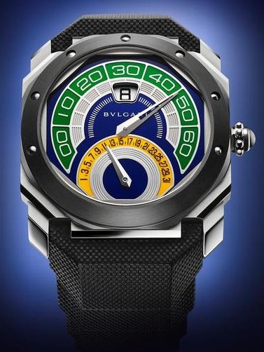 BVLGARI宝格丽以Octo Bi-Retro双逆跳腕表向巴西致意。该款腕表整体的色调出挑,由色彩鲜艳的蓝、黄、绿三色组成,全球限量发行50枚。