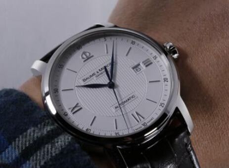 在银白色的表盘上采用雕花纹路的方式做设计,镶嵌的蓝钢罗马时标力挺凸显,方便阅读时间。在6点钟位置为60秒小秒针表盘,方形窗口为日期显示窗口。整款腕表看上去十分典雅朴素,但在表盘精美的螺旋纹和抛光蓝钢指针的衬托下显得更为别致。蓝色剑形指针和蓝色阿拉伯数字时标,配以银白色的表盘,让人在视觉上感觉清新,且在读时的时候也比较方便。日期显示功能与小秒盘在6点钟方向重叠。参考价格:16000元