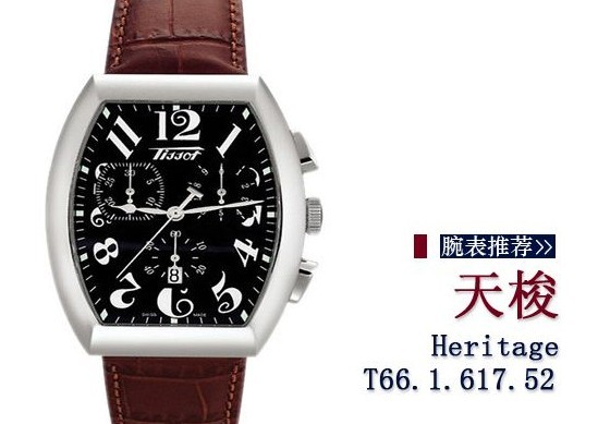 天梭Heritage男士石英表T66.1.617.52携带着251.471QUARTZ机芯,酒桶形的黑色表盘由黑色珍珠贝母打造,深棕色皮质表带,共有23颗宝石,防水深度为30米。本款产品造型上来看属于怀旧经典款,比较适合追求复古的年轻人佩戴。