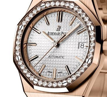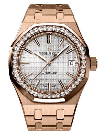 新款皇家橡树系列37毫米自动上链腕表还备有精钢款和玫瑰金款以供选择,包括镶钻款和无镶钻款,搭配黑色或银色表盘,同时腕表亦可搭配真皮表带或精钢/玫瑰金表带。