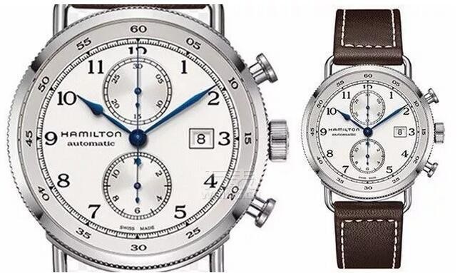 这款腕表采用了白色的表盘,蓝钢指针和黑色的阿拉伯数字刻度。腕表的整体设计传承了汉米尔顿卡其海军船钟系列的经典造型,所以很有怀旧经典的味道。这款腕表最特别的地方在于两个拥有计时功能的小表盘,12点钟位置为30分钟计时显示表盘,6点钟位置为12小时累计计时显示表盘。刻度12被小表盘遮掩住了一半,很多人将此解读为欲说还羞的意思,同时刻度6也与之相呼应,直接消失了。