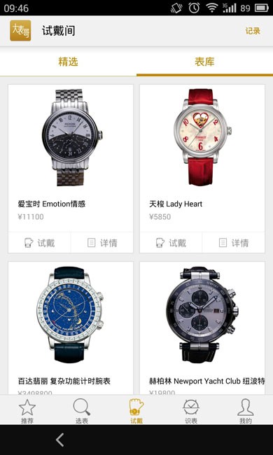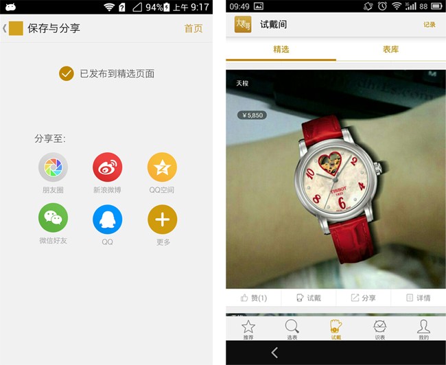 手表以最佳的角度与亮度“戴好”之后,可以在精选页面看到试戴效果。也可以在“记录”里面查看个人的所有试戴记录。还可以分享朋友圈、空间,让大家都来围观你的“新表”。