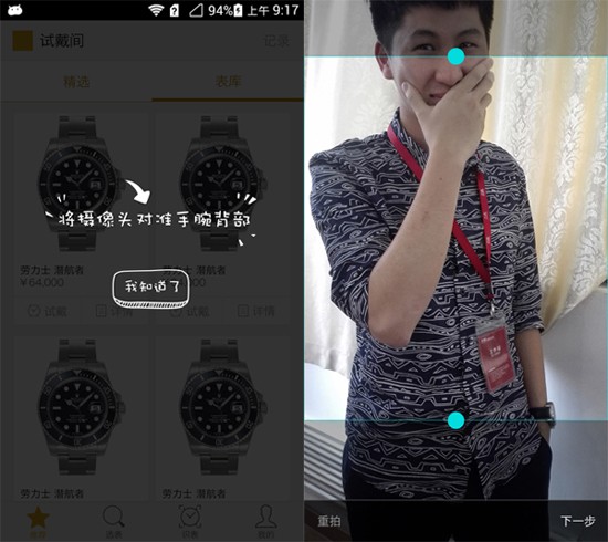 看到喜欢的表款,点击试戴。可在自己相册选择适合戴表的腕部图片,或者选择相机,将摄影头对准手腕背部拍照。