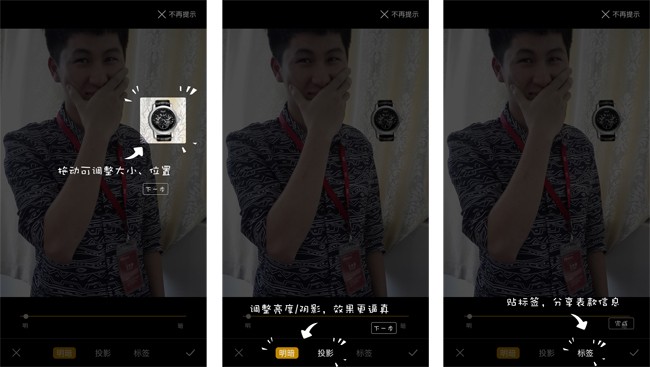 拖动表图可调节大小、位置及倾斜角度,下栏的“明暗”和“投影”,可以自主调节亮度与阴影,让手表“戴在”你手上更加逼真。点击“标签”可贴上表款品牌与价格等信息,表款信息一目了然。标签可以自由移动,你可以根据自己的美学判断或兴趣爱好来决定它的位置。