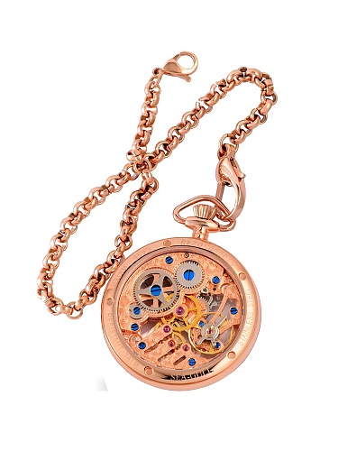 背面透底设计,更加直观的展现机芯的运作,不管是功能还是外观都很好的彰显出机械的生命。表针采用了古典风格,表盘上刻度是罗马数字,更增加了这款怀表的古典优雅的气息。镀玫瑰金的表带和表把,适合绅士们细细把玩。