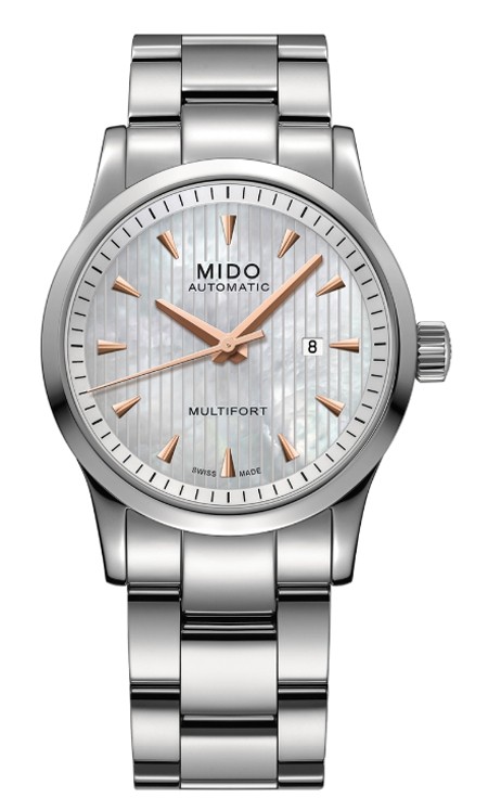 表盘 白色珍珠贝母表盘饰以垂直线条,独立刻度,日期窗位于三点钟位置。