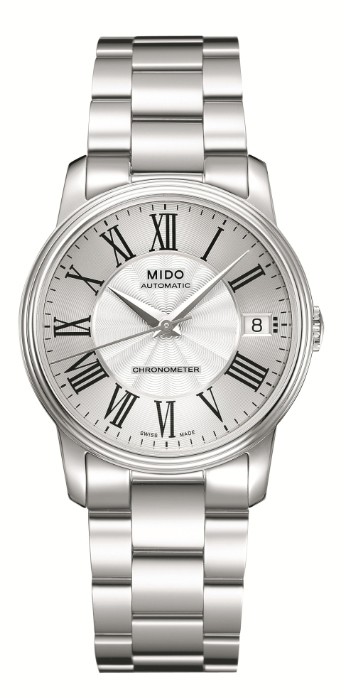 饰以蓝色螺钉,摆陀雕刻日内瓦波纹和MIDO标志。时分秒日期显示功能。