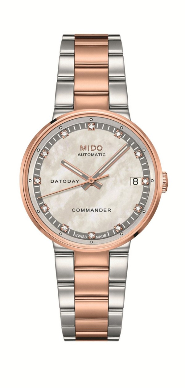埃菲尔铁塔虽采撷铮铮铁骨却依旧有柔情的一面。指挥官系列女士钻石腕表在传承俊逸外形的同时融入柔美的设计元素。33mm的表盘采用珍珠贝母材质,每一款腕表都闪耀着独一无二的光芒,正如每一份爱情都无可替代。玫瑰金表盘镶衬12颗天然钻石,相映成辉,金粉光芒由腕间尽情释放,妆点了女性高贵典雅的一面。钻石切割的指针游走于流光溢彩的表盘上,经白色Super LumiNova®夜光处理,确保夜间读数清晰。316L不锈钢镀PVD玫瑰金的间金表带赋予女性刚强之感,打造女性华丽而不俗的气质,令人倾心神往。两款腕表如同两个坚强独立的个体,在玫瑰金的光芒中,共同沐浴着爱情。
