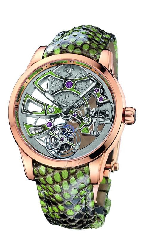 此枚野性的呼唤腕表犹如茂盛丛林一样生生不息,也保留了原创版本的风格,选用 18K玫瑰金表壳,限量发行 18 枚,球蟒镂空陀飞轮为不羁的心表现出无畏精神。